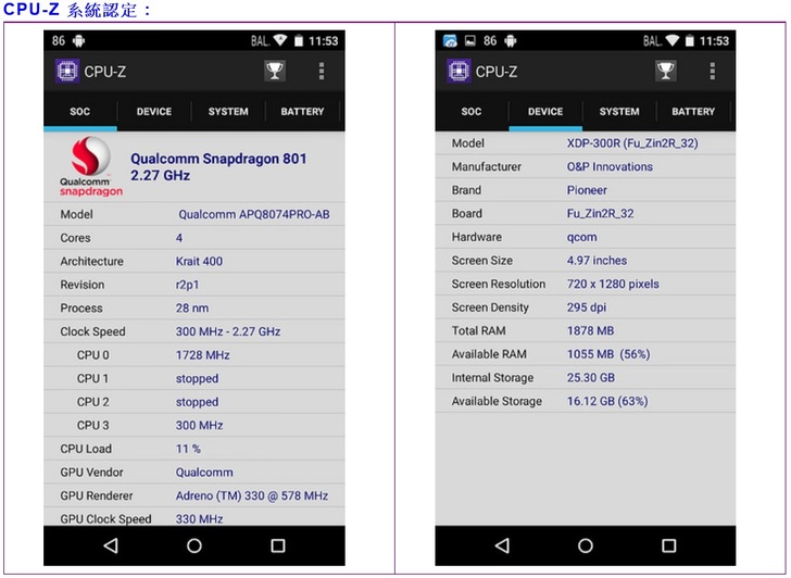CPU : Qualcomm S801 2.27GHz / 2G DDR3 RAM