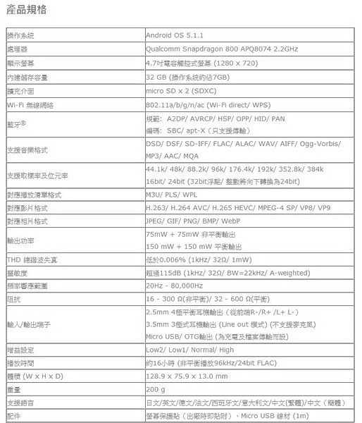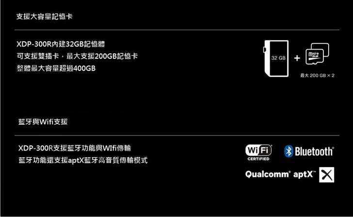 剛說到XDP-300R擁有完整的Android功能,規格請自行參考一下,其實性能還不差,內建32GB記憶體雖然不大,但可以雙插卡,每個卡槽最大支援到200GB,也就是說本機最大可以有432GB空間,但扣除系統程式與記憶卡格式化的損失,超過400GB應該沒有問題。此外XDP-300R本身支援藍牙功能與Wifi功能,其中藍牙功能還支援aptX高音質藍牙傳輸模式。如果在房間裡不想帶耳機,搭配一個好一點的藍牙喇叭,其實也是不錯的。