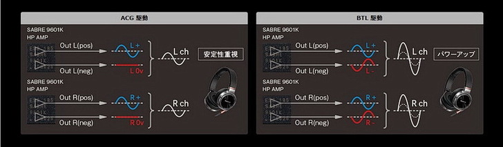 至於ACG(Active Control Ground)模式,則是新一代的平衡模式,將左右聲道的負極輸出電壓都限制在0V,並藉由放大線路將該端子接地,來降低雜訊,讓聲音更純淨。利用ACG模式輸出的聲音會比傳統BTL模式輸出來得純淨,雜訊更少。這一段的學理你不懂沒關係,只要點頭稱讚,不要讓別人知道你啥都不懂就好,總之記得四極平衡輸出加上ACG平衡模式,聲音會很好就是了。