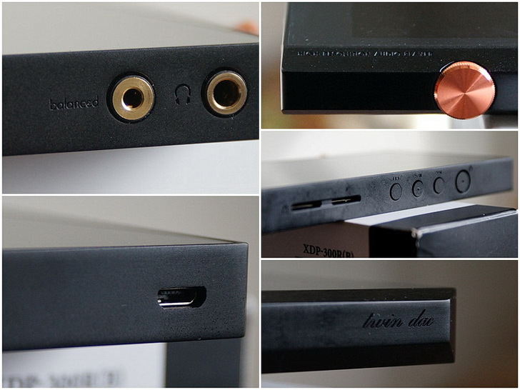 播放機上方兩個耳機孔,一個是3.5mm傳統插頭用,一個是2.5mm四極平衡插頭用,廠商有特別交代,不可以同時使用兩款耳機,否則機器很容易燒毀!!下方有Micro USB接口可OTG/DSD數位輸出。右邊是電源開關等按鈕與雙記憶卡插槽,左方除了搶眼的古銅色旋鈕,上面與下面另有刻字。整體看起來低調穩重。
