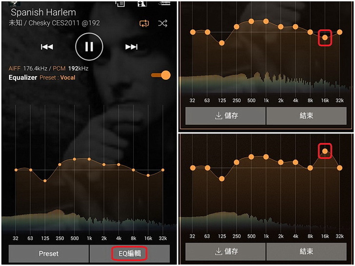按下EQ編輯,11段等化器上的橘點變大顆了,這次我想要調整的是中高音16K的部分,我按住16K的那顆橘點往上滑動,那個頻率就被我加強了,但是這不會影響其他頻率,稱之為高精準EQ調整。