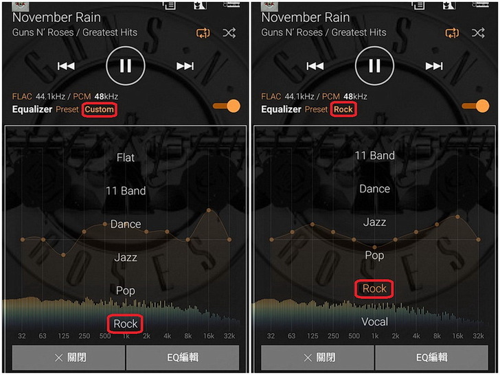 但如果我不想亂調整等化器,但我知道下一首歌是Guns N' Roses的搖滾歌曲,我也可以選取播放器預先設定好的EQ模式,搖滾樂當然要選Rock模式囉