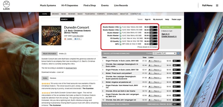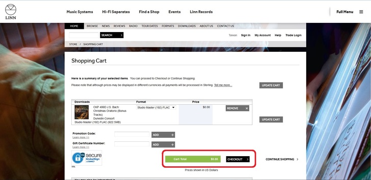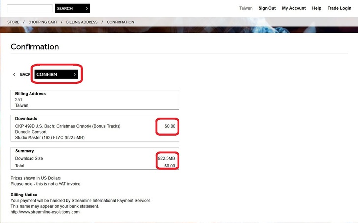 看到沒,單價是0.00,也就是免費的意思啊,看到免費哪有不下載的道理,可是下載選項那麼多要選哪一個,我建議選FLAC,24bit,192KHz的那一個,一次就攻頂吧。按下BUY的按鈕會出現結帳的畫面。