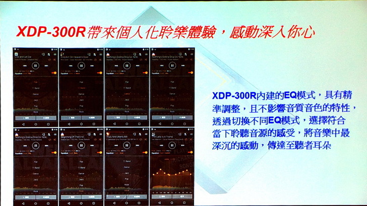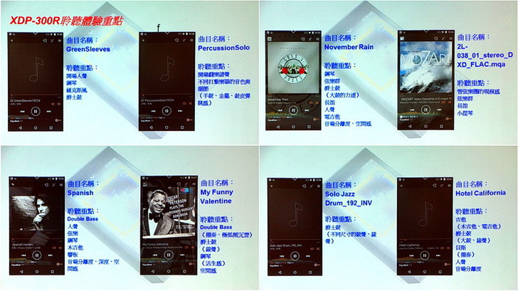 這次Pioneer提供了數首高解析音樂讓大家試聽,那要聽什麼?聽細節囉,以前我們都會忽略這些小細節,如果是古典音樂的現場錄音,我們可以試著去聽樂師翻樂譜的聲音,如果我們聽的是爵士樂,可以試著去聽樂手吹薩克斯風換氣的聲音,如果聽的是弦樂,可以聽到琴弓摩擦的聲音。如果聽管弦大樂團演奏,如果耳朵夠靈敏,可以聽出那個樂器在前那個樂器在後,也就是所謂的定位感與臨場感,高解析音樂與一般音樂最大的差異就是保留了細節,而XDP-300R可以將這些細節演繹出來,如果利用四極平衡耳機搭配BTL/ACG模式來播放效果更是明顯。
