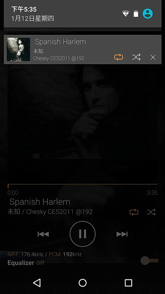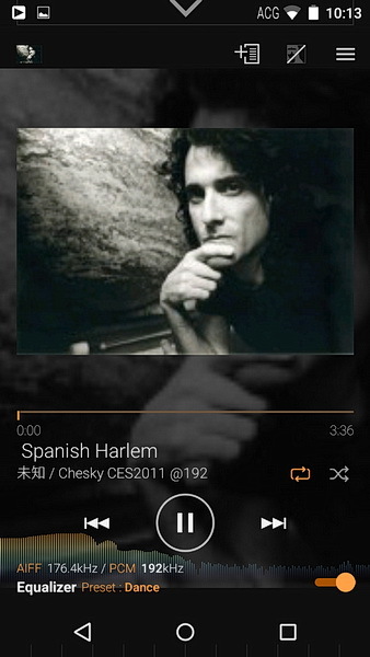 按下方左邊有個朝右箭頭的圖案(上圖紅框位置),找到你存放歌曲的位置,選擇了你想聽的歌曲後,此時銀幕的變化就不同了,曲名,檔案格式,取樣頻率寫得清清楚楚,如果你有專輯照片,也會在銀幕中出現。下方更有EQ等化器跳動的畫面。