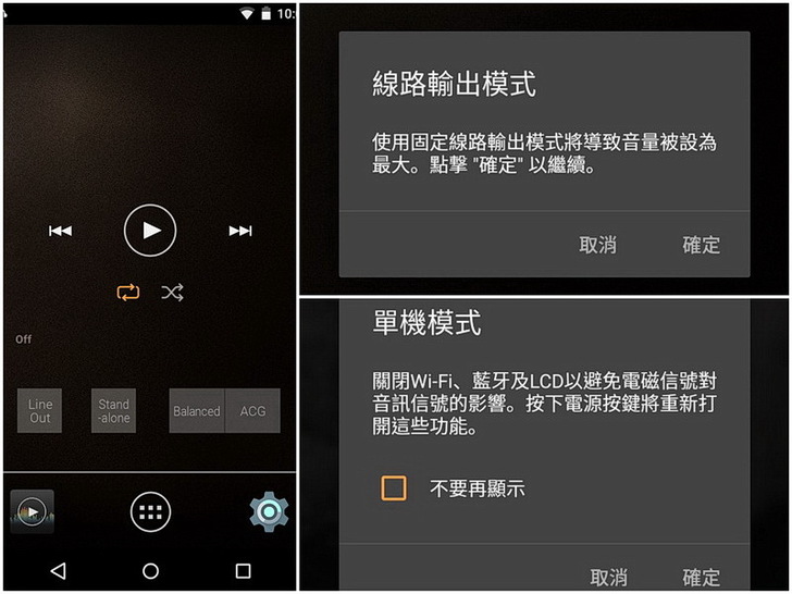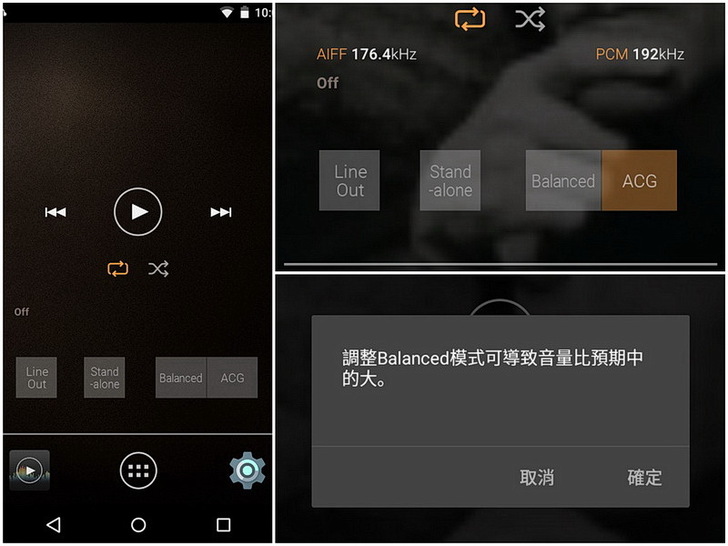 ACG模式也是在此畫面下選擇,但如果要切換到BTL平衡模式,則會出現警語,要你留意音樂會變大聲,你按了確定才會切換過去。(使用4極平衡耳機才有功用)