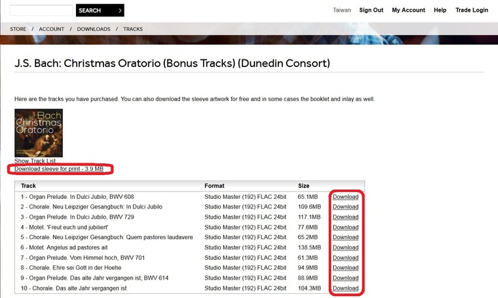 搞了半天,終於到了下載畫面,本專輯有10首曲子,右邊那10個Download請按下去,讓電腦去下載囉,如果想要唱片封面,左邊紅框按下去。如此就功德圓滿了。