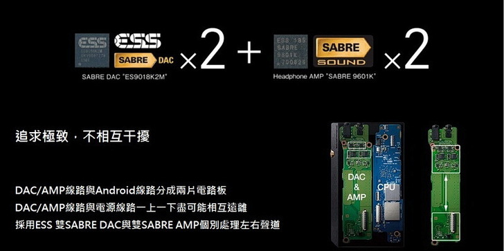 左邊綠色電路版是DAC/AMP線路,右邊藍色是Android線路,而左邊DAC/AMP線路在上方,靠近耳機端子,下方是電源線路,兩者盡可能的拉遠,一切都是為了避免電磁波相互干擾。而DAC與AMP也是精心挑選雙ESS Technology SABRE DAC 「ES9018K2M」 與SABRE AMP 「9061K」,處個別理左右聲道音源,避免左右音源相互干擾。