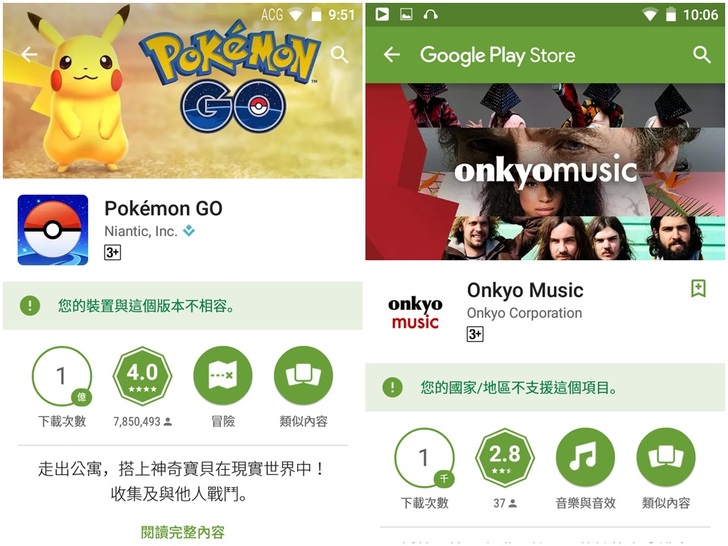 既然有Android系統與Google Play,我很好奇的連上了Google Play,殘念,不能玩神奇寶貝,一邊抓寶一邊聽音樂的白日夢破碎(其實這樣也太危險了),另一個讓我疑問的是Onkyo Music這個App在台灣也不能下載,既然在台灣賣高階音樂播放器了,卻又不讓人在官方的音樂網站購買音樂,實在想不通。[據說透過VPN就可以]。