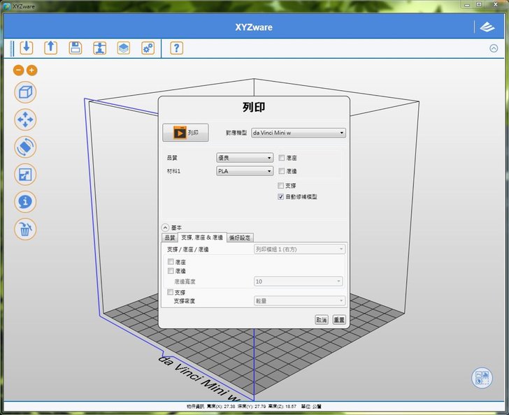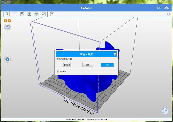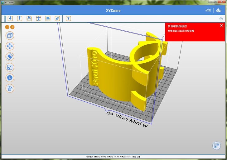 把編輯好的檔案或是下載下來的檔案用XYZware讀取出來即可列印,不過有些編輯有問題的會有像右上角的提示,問要不要自動修復破損,我也是第一次用就啟用自動修復吧!