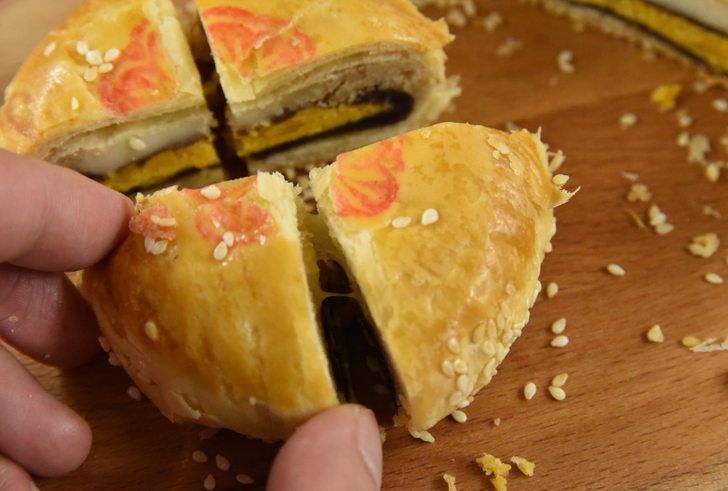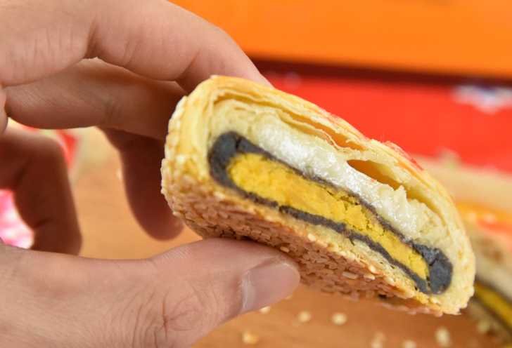 內餡真的好豐富喔!!!! 有麻糬、紅豆泥、鹹蛋黃跟夏威夷豆奶酥....很厚實飽滿!!