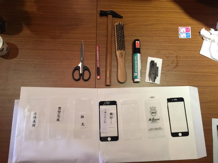 上方是今天要測試的工具,由左至右一次排開:剪刀、美工刀、鐵鎚、鋼刷、油性麥克筆。下方是廠商帶來的樣本,為一塊玻璃保護貼一步一步的生產過程!在還沒有加工之前,他真的就只是一般的玻璃!因為有其他網友再拍攝的時候不慎將前面一片掉落在地上就發出清脆的聲音破裂了!