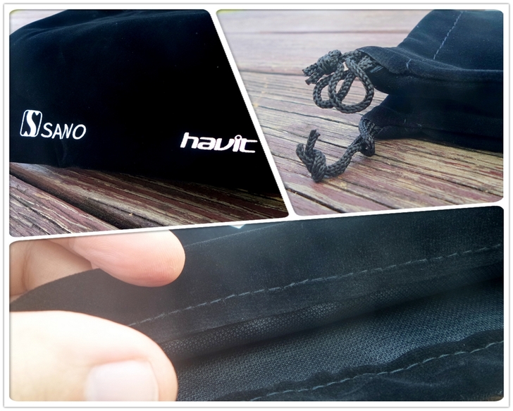 【▼】APEX STAND包裝旅行袋背面也印有havit與旗下SANO實驗室的字體,縫線部分整齊劃一,小編覺得還蠻精緻的,倒是束口袋的部分,建議可以加上木頭按壓的控制,讓線頭處理更為完善。