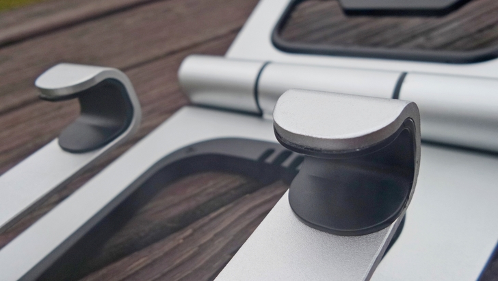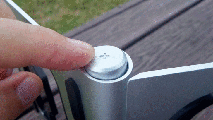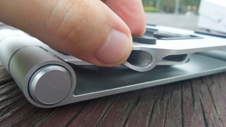 【▼】至於不可按壓的那一面則是呈現同心圓的金屬紋路。這邊要與大家說明的重點是兩組單軸承的設計是有段數的,也就是說當按壓圓軸時,除了可自由調整角度外,放開即能卡住某一範圍的角度,小編試了一下,約有10段,每段度數約18~20度左右,有段數的好處就是能夠支撐較重的物品,不至於平放太重而垂落角度。