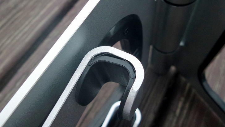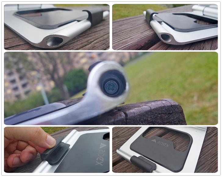 【▼】APEX STAND前方下緣的黑色固定架,左右兩側為通孔處理,並由十字螺絲調整緊度,讓使用者可以調整手機在黑色固定架的角度,建議不要調太緊,約略77%緊度是最適當的。