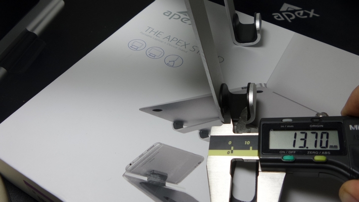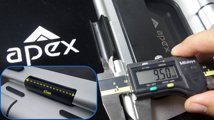 【▼】APEX STAND前方手機固定架,寬度為45mm,而溝槽的厚度為9.5mm,放置九成以上的手機、平板也沒問題。