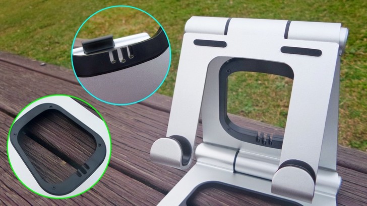 【▼】APEX STAND不論主體底部還是放置或支撐裝置的地方都貼有防護膠墊,主體底部與支撐裝置的橡膠較軟有防滑特性,放置裝置的橡膠偏硬也較為較為光滑。
