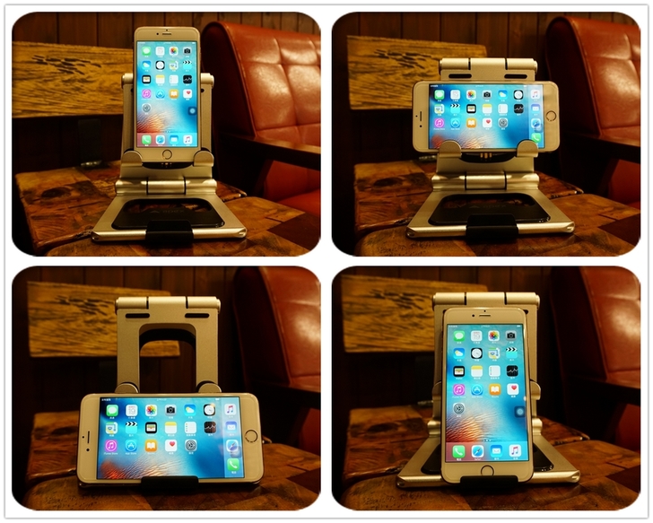 【▼】當iPhone6+擺在上方支撐架上,可以看見安全凹槽內還有很充裕的空間,而將iPhone6+置於下方固定架上,除了可以旋轉螺絲調整角度外,也可以倚靠上方的安全凹槽來穩定。