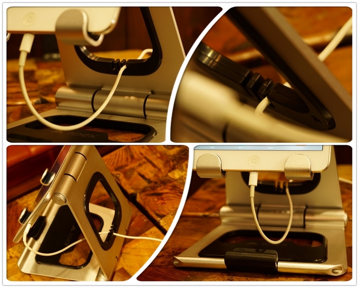 【▼】在使用iPad mini2進行充電或資料傳輸時,Lightning線只要輕扣住APEX STAND後方的整線凹槽內即可扣住,這時Lightning線不會左右移動,但前後移動還是可行的。