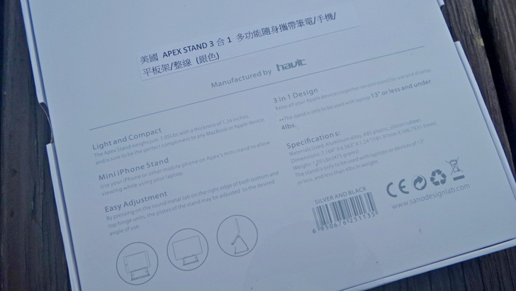 【▼】APEX STAND彩盒底部的資訊就比較多元,有加強整線槽、可放置小手機與簡易調整的重點,並有製造商與基本規格的資訊,此款也有其限制條件,就是不能使用於13吋或4磅重以上的筆電。