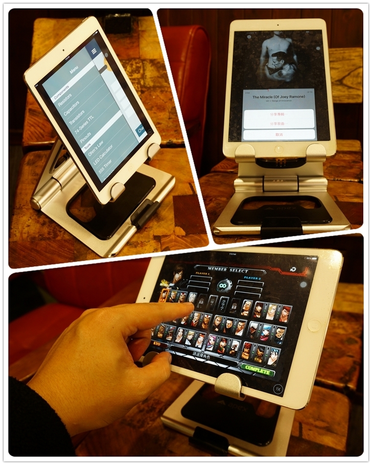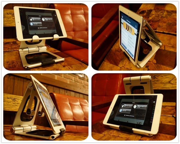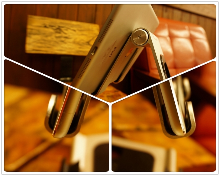 【▼】第二戰是APEX STAND VS iPad mini2的展示,由於iPad mini2是七吋的平板,所以還在APEX STAND容許的範圍內,這個尺寸擺在下方的固定架上,不論直放還是橫放,都能看出APEX STAND與iPad mini2呈現完美三角形的平衡。