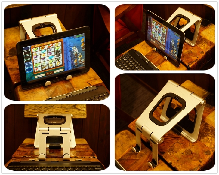 【▼】將iPad mini2放在APEX STAND上方支撐架上,一樣可以看出平衡三角結構的延伸,底部防滑膠墊發揮強大功能,不會一觸控就整個平板架往後移,打電動在激烈也不怕!