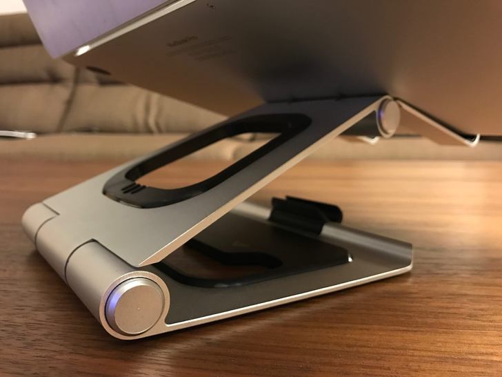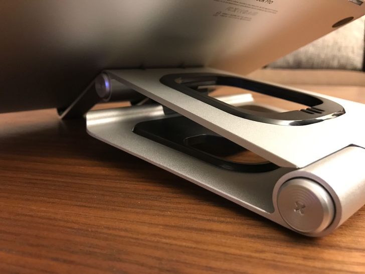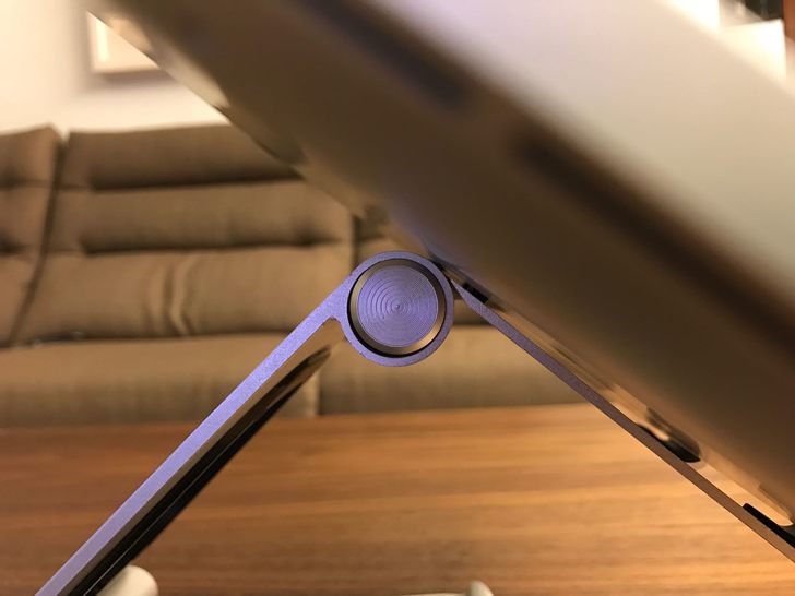 ▼ 換個角度,側面是轉軸的調整鈕,必須要壓下才能調整,鬆開角度就會固定。鋁合金材質的 Apex Stand 承重可達到 2.5 公斤,以一台 15 吋的 MacBook Pro 來說才也兩公斤多一點,因此重量不成問題,但因為角度是可以自由變換,所以還得考驗使用者的物理概念,如果沒有調整到適合的角度,筆電可能會直接倒頭哉,算是相當「進階」的產品啊!(汗)