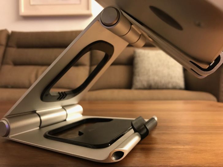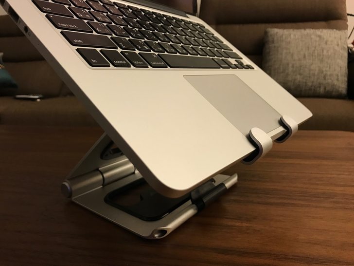 ▼ 如果將 Apex Stand 壓成最低角度,變成前後兩端接觸桌面、底座懸空。低角度的重心其實更穩,而且這樣的角度剛好可以直接使用筆電的鍵盤跟觸控板,不需要再搭配外接鍵盤跟滑鼠。