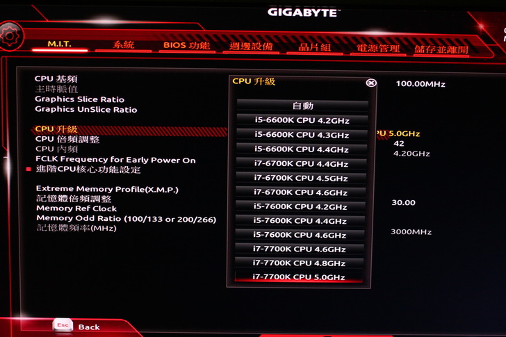 ▼ AORUS Z270X-GAMING 5 真的是簡易無腦超頻,筆者在 M.I.T 進階頻率設定 CPU升級選項,直接就可以選擇 i7-7700K CPU 5.0GHz。