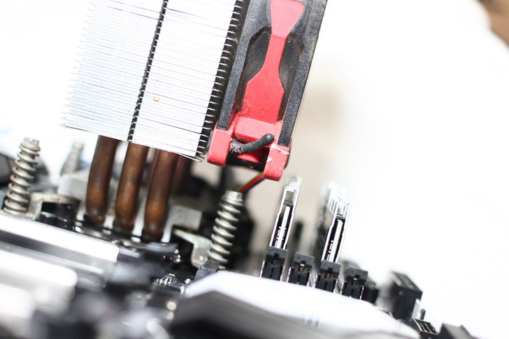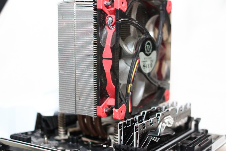 ▼ 筆者使用現役的 塔型散熱器 來幫助處理器散熱,照片所示可發現 處理器跟記憶體的 間隔夠大,就算使用 大型散熱片的記憶體,使用上也不會卡到 塔型散熱器的安裝。