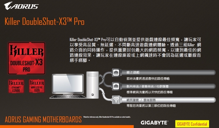 ▼ Killer DoubleShot-X3™ Pro:自動偵測並提供遊戲連線最快的網路傳輸速度,次要的網路速度則用在 社群、影片、音樂,零散的流量則用在網頁…等。