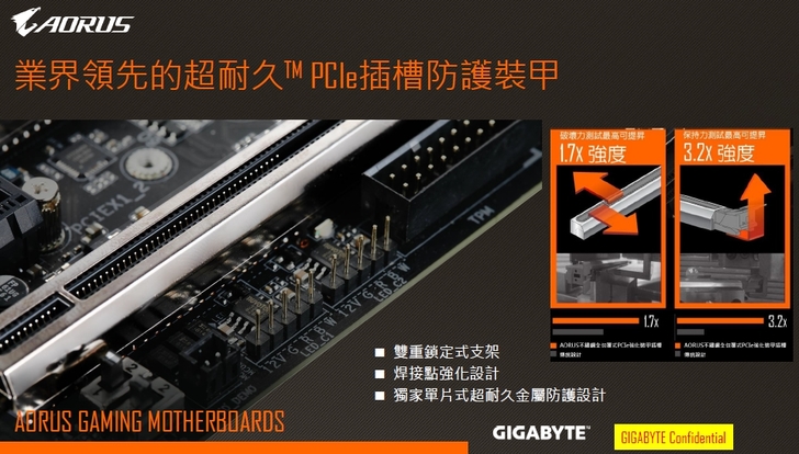 ▼ PCIe插槽防護裝甲:雙重鎖定式支架、焊接點強化、單片式超耐久金屬防護設計。(有效解決大型顯示卡的重量問題)