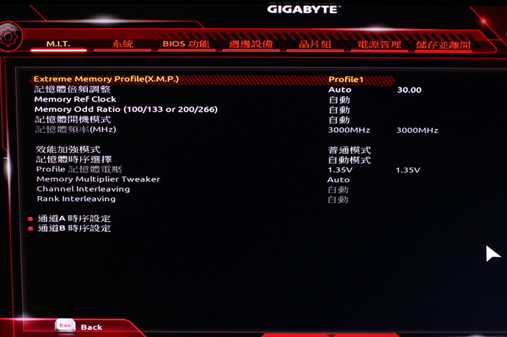 ▼ M.I.T 進階記憶體設定,直接點選 Profile1,記憶體馬上就 自動調整至 3000MHz。