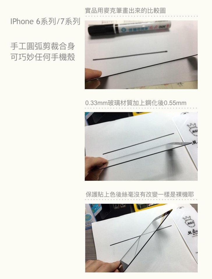 在此說明一下奉勸大家注意 7 系列的保護膜因話筒孔洞設計上 完全不一樣,貼上去會把光度完全照住也沒辦法有自拍功能, 光線也會變很暗哦!所以千萬別像我買錯了又貼上 6 系列的手機。厚度為 0.55mm 的膜法女王防爆玻璃保護貼雖然比別家的多了一點點厚度!不過在我看來是有著耐用之處是,在防指紋、防水、防油下竟 然還可以抗刮、防爆功能,在這極具特色又超服貼的包覆下實 在無法抗拒划順的觸感,質量細膩度可是無可厚的絕加保護。