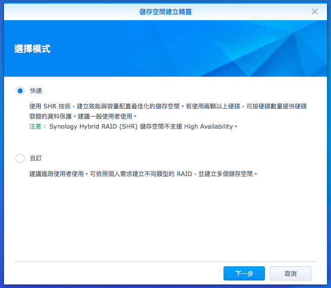 這邊可以選擇快速模式,讓 NAS 根據目前硬碟來最佳化設定儲存空間,或是選擇自訂模式設定各種 RAID 模式。這邊因為我只用了一顆硬碟來作為設定範例,所以選擇快速模式,完畢後按下一步。