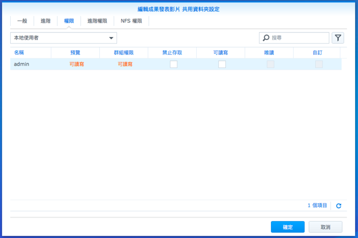 在這個畫面可以設定資料夾的使用權限,現在我們只有一個使用者,所以可以按下確定後繼續。