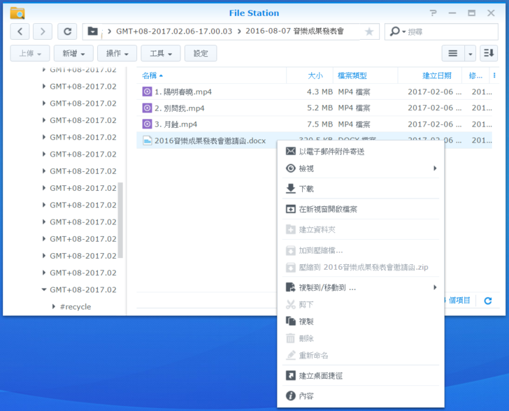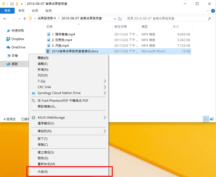 不用擔心,就讓 Synology Btrfs 的快照功能救回原本的檔案。在壞掉的檔案上按下右鍵,選擇【內容】