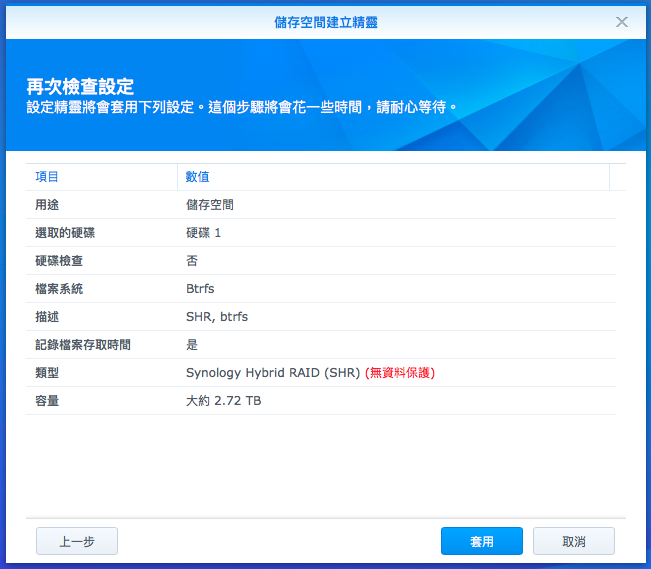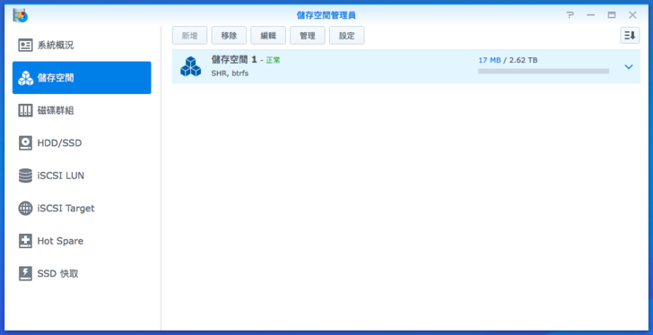 建立完畢!可以看到我們已經建立了一個 2.62TB 的【儲存空間 1】
