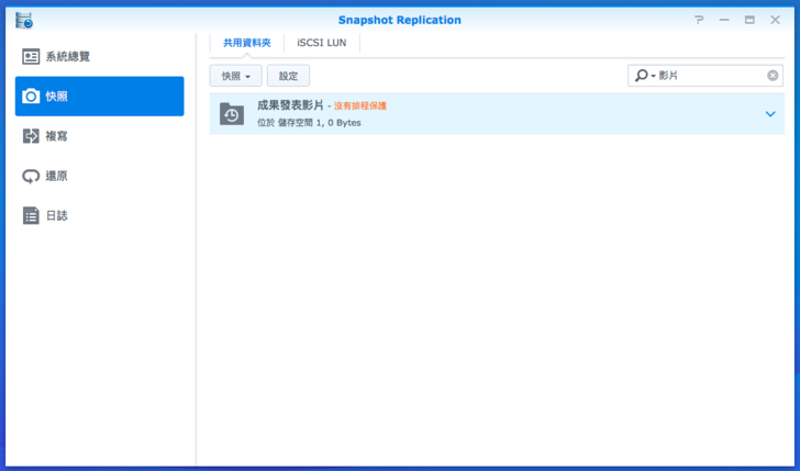 安裝完之後就可以打開 Snapshot Replication 這個程式來設定快照,打開程式後切到快照分頁,可以看到目前成果發表影片這個共用資料夾還沒有設定排程保護,按下設定按鈕之後開始來設定吧!
