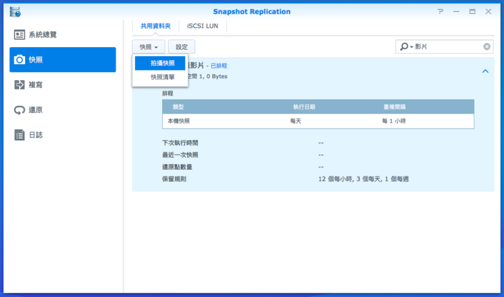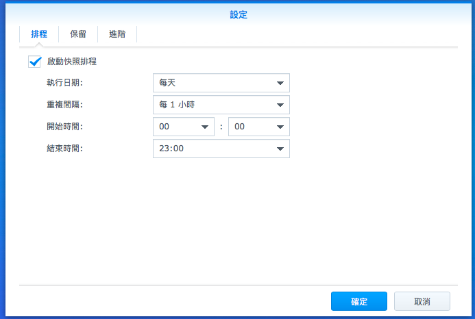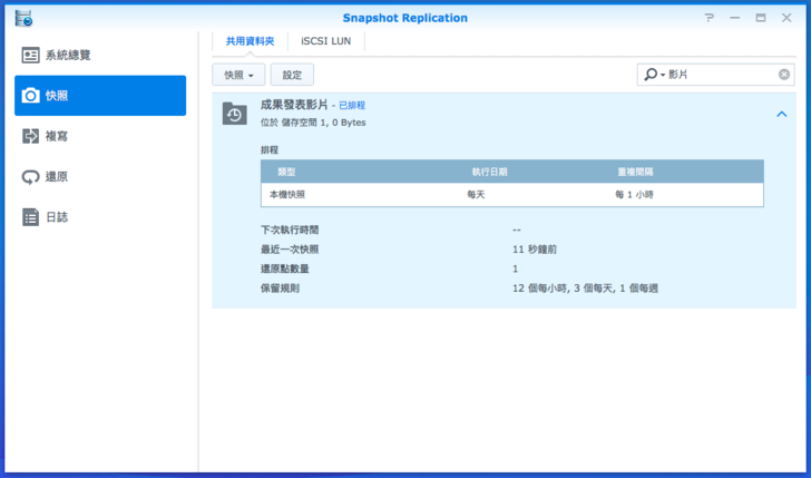 快照排程的設定十分彈性,從每天、每小時到最快可以設定每 5 分鐘就拍攝快照一次,因為影片不是常常更新,所以可以設定一小時拍攝快照一次就好。
