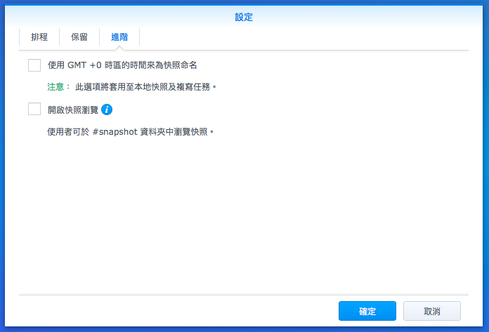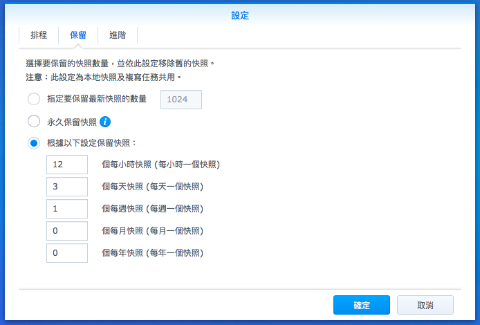 在這個分頁,我們可以根據快照數量來留下最新幾筆快照,或是根據彈性規則來保留快照,不建議設定為永久保留快照,因為一旦快照到達上限就不會再拍攝快照,需要手動刪除才可以恢復。下面我們設定的是保留最新 12 個小時、最近 3 天、最近 1 週的快照。