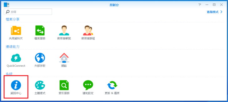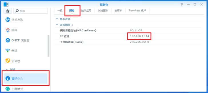 開啟控制台的資訊中心,切到網路分頁,如紅框所示,就能夠知道 NAS 的 IP 位址了