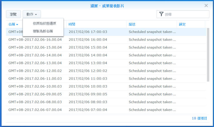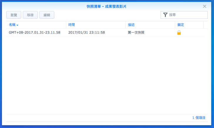 除了排程的快照,我們也可以手動拍攝快照,只要幾秒鐘,就可以備份目前共用資料夾內的所有檔案。