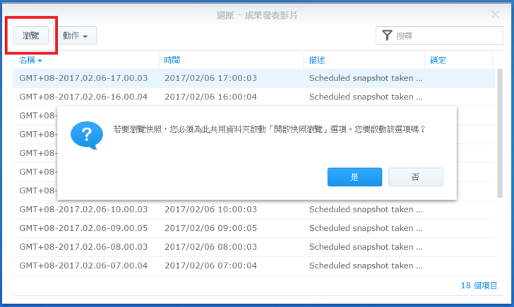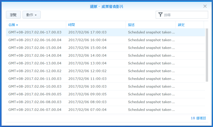 開啟快照瀏覽功能後,就可以在 NAS 的操作介面選擇不同時間點的快照備份,也可以找到正確的快照時間點來還原了。