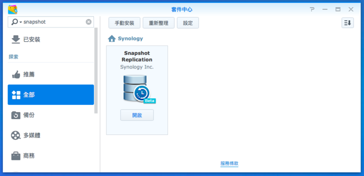 再來我們要安裝可以設定快照功能的應用程式,打開套件中心,輸入 snapshot 就能夠找到這個應用程式進行安裝。
