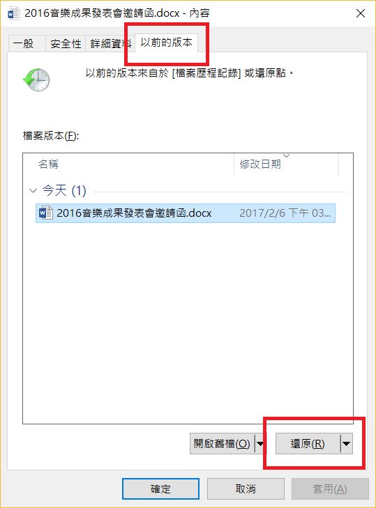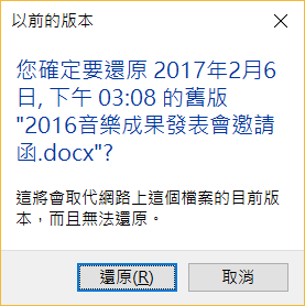 視窗開啟後,切換到【以前的版本】這個分頁,就可以看到邀請函先前沒有被修改的版本,按下還原按鈕後繼續。