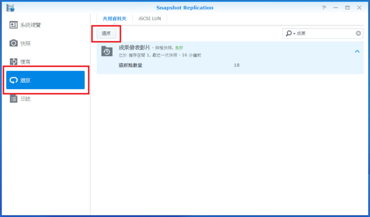 不用煩惱,在資料備份上我們已經有萬全的準備。首先打開 NAS 上的 Snapshot Replication,切換到還原選單,並且點選還原按鈕。