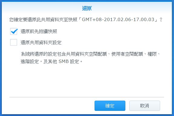 為了預防萬一,在開始還原之前還是可以再拍攝一次快照,按下確定按鈕之後就開始還原囉。