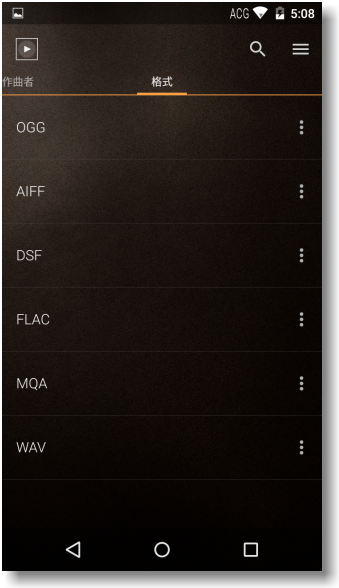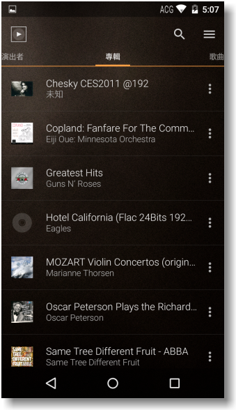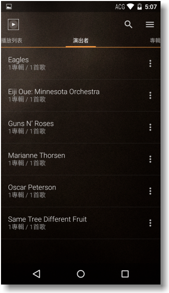 ▲另外和大部份播放程式一樣,也能以演出者、專輯、歌曲、類型、合輯、作曲者和音樂檔案格式的方式來選擇。
