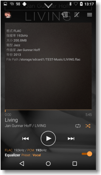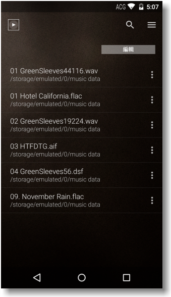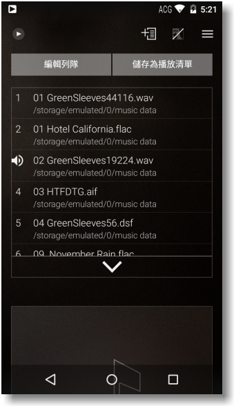 ▲輕點封面圖片後就會顯示曲目的更多資料;若往下滑動則會出現文件夾裡的歌曲檔案列表。